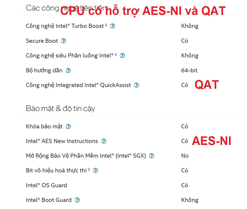 Dòng CPU cao cấp của intel hỗ trợ AES-NI và QAT (công nghệ độc quyền của intel);